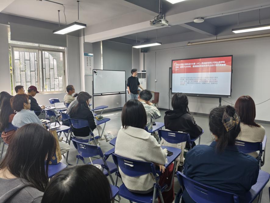 宣讲会伊始,教师李天昊主持开场,系统介绍了中国大学生计算机设计大赛的发展背景与赛事重要性。他明确指出,该赛事是教育部认可的A类学科竞赛,自2008年创办以来,始终以“以赛促学、以赛促教、以赛促创”为宗旨,是国内面向高校本科生设立的权威科创赛事,对提升学生数字创作实践能力、跨学科融合应用能力具有重要意义。