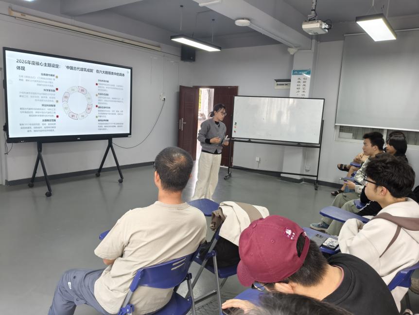 随后,教师王新宇围绕赛事核心内容展开细致解读。他结合官方文件,明确了校赛、省赛、国赛三级赛制的全流程时间节点,重点标注了各阶段关键截止时间与不同赛区的赛程差异,帮助师生精准把控备赛节奏;同时全面梳理了赛事11个竞赛大类的设置,重点解读了数媒相关赛道的创作要求,标注了适配本专业学生参加的赛项,明确了本年度赛事“中国古代建筑成就”的核心主题;并详细讲解了参赛组队资格、作品原创性规范、AI工具使用要求等核心标准,帮助师生规避创作与参赛过程中的常见问题。